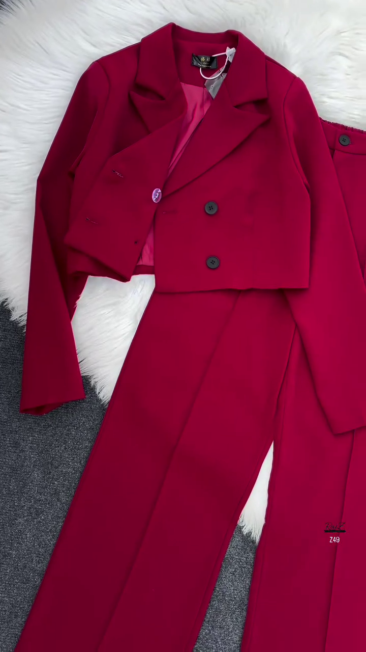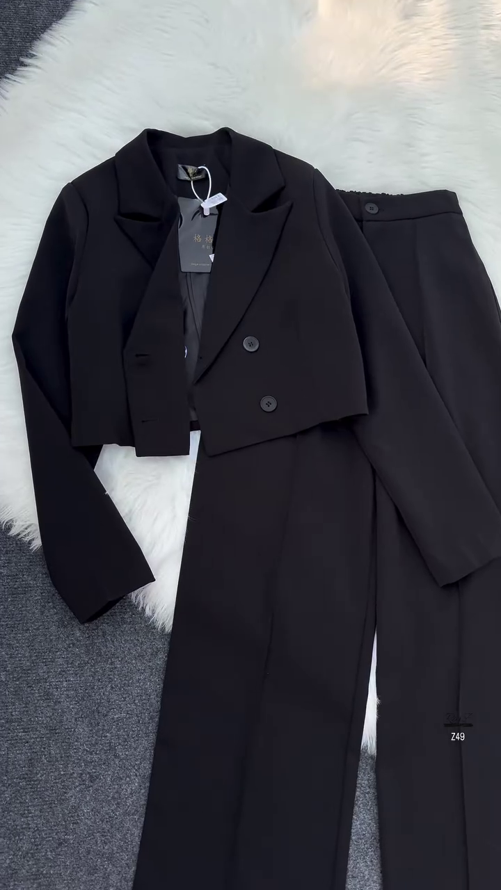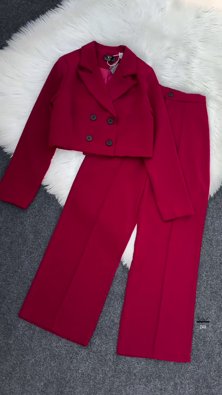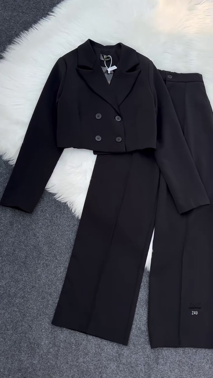 • Blazer: Cropped length with a sharp lapel collar and double-button front, giving it a contemporary structured look.