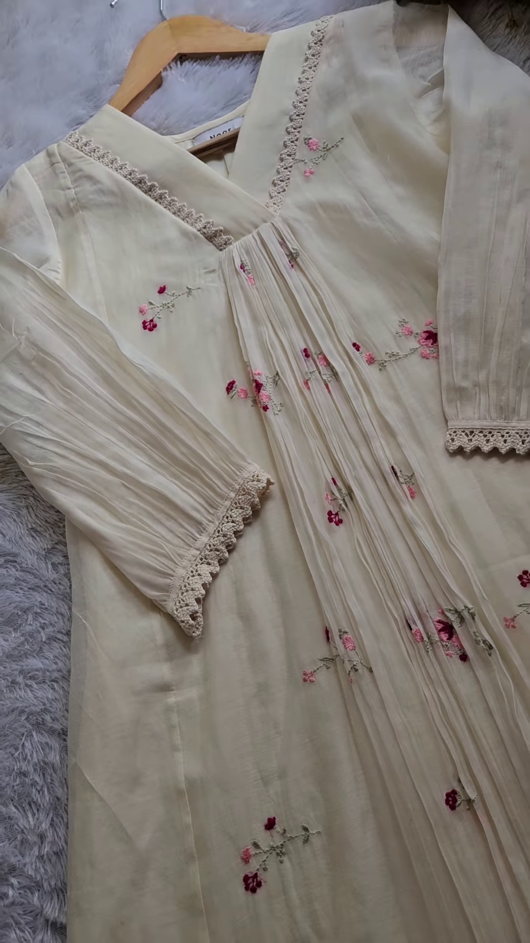 Sprinkled across the cream fabric are small, delicate floral embroidery motifs. These appear to be in a contrasting color, perhaps a soft pink or a muted red, adding a subtle pop of color and a touch of natural charm to the design. The floral embroidery is likely scattered thoughtfully, creating a balanced and aesthetically pleasing distribution across the fabric. The size of the floral motifs is petite, contributing to the overall delicate feel of the garment.