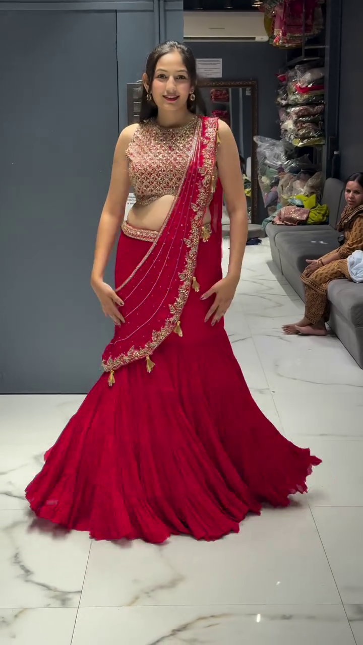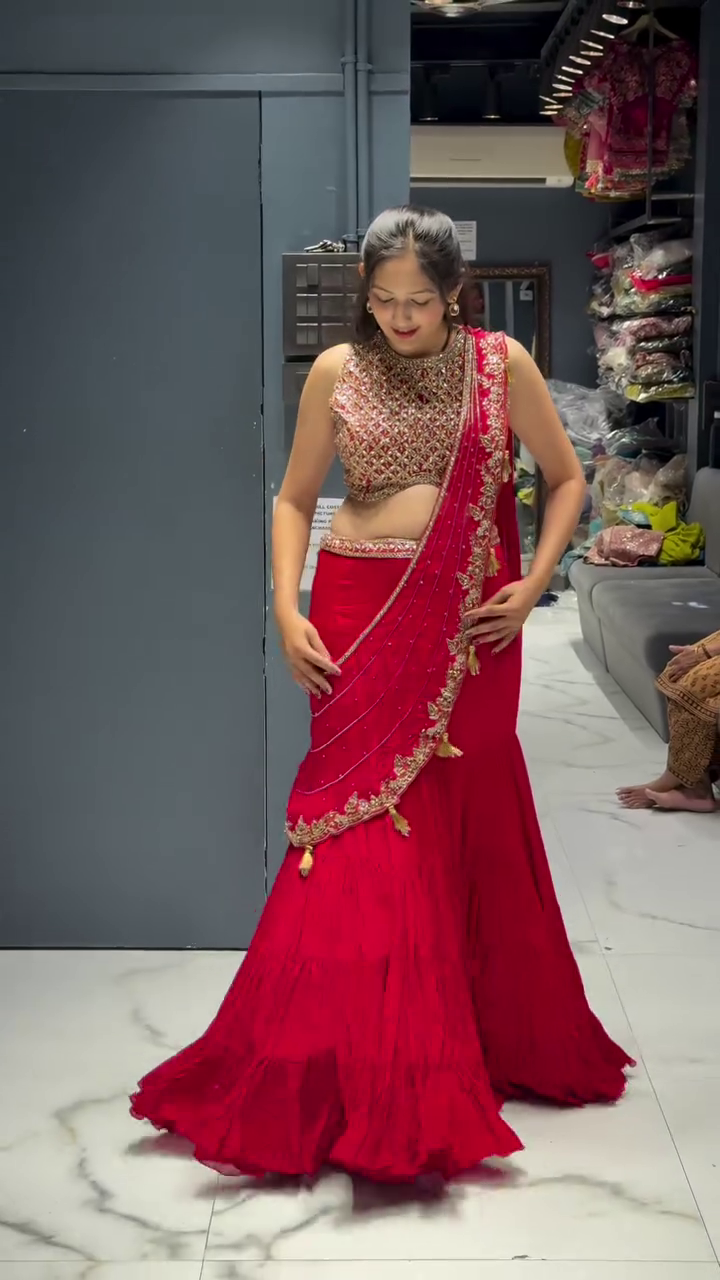 The lehenga features a graceful fishtail cut that hugs the waist and hips before flaring out dramatically at the hem. Its rich red fabric is enhanced with subtle pleating, adding depth and fluidity to the silhouette. The blouse is heavily embellished with zari, sequins, and beadwork in intricate patterns that shimmer beautifully under light. A unique draped dupatta-style pallu, attached to the blouse, cascades gracefully over one shoulder. It is adorned with delicate embroidery, golden tassels, and border work, making it a statement piece of its own.