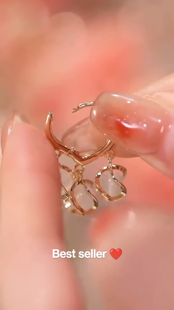 Each earring features a lustrous, warm-toned metal base that forms a secure and comfortable hoop or small hook design, ensuring ease of wear. From this elegant base, a cluster of ethereal, translucent elements gracefully descends. These elements are artfully shaped to resemble soft, luminous petals or delicate dewdrops, reflecting light with every movement. The material of these “petals” appears to have a gentle iridescence or a milky, opalescent quality, creating a captivating glow that beautifully catches and diffuses light, adding a subtle shimmer to your appearance.