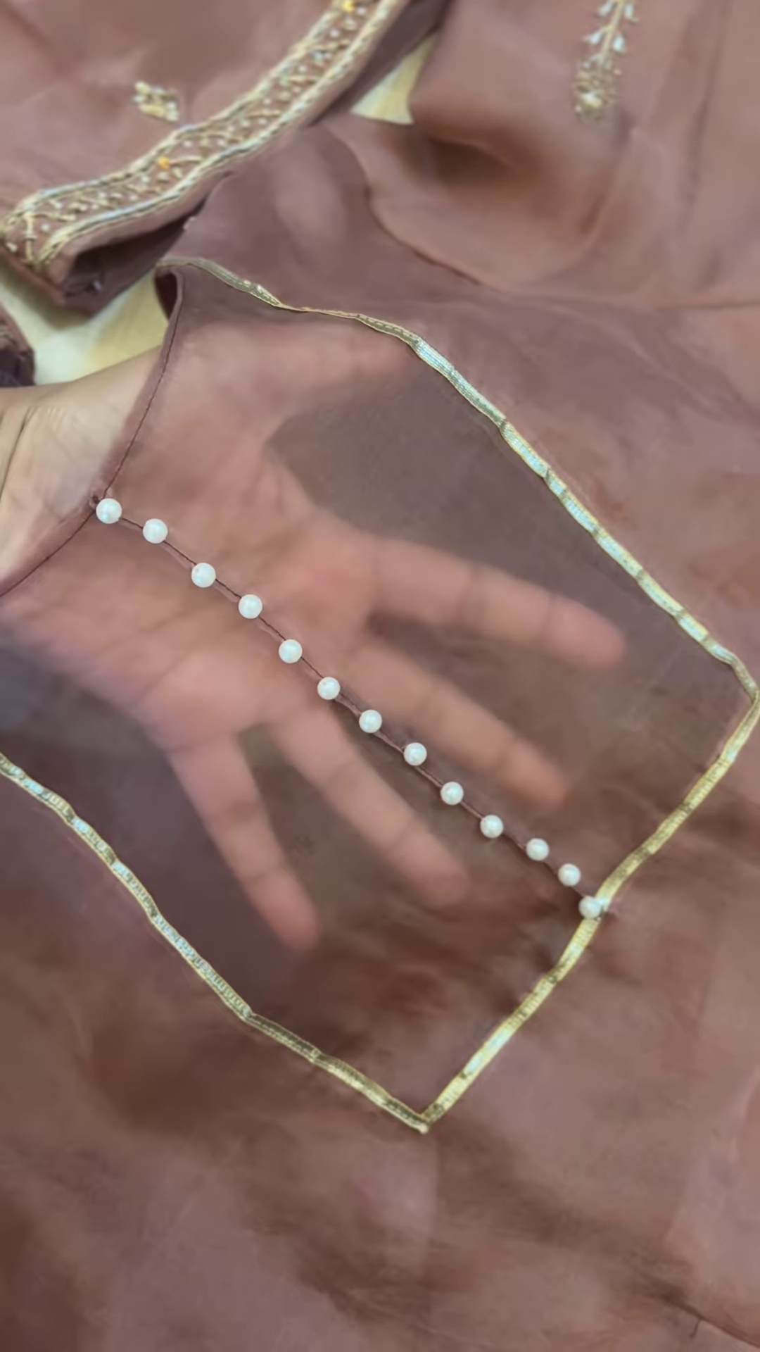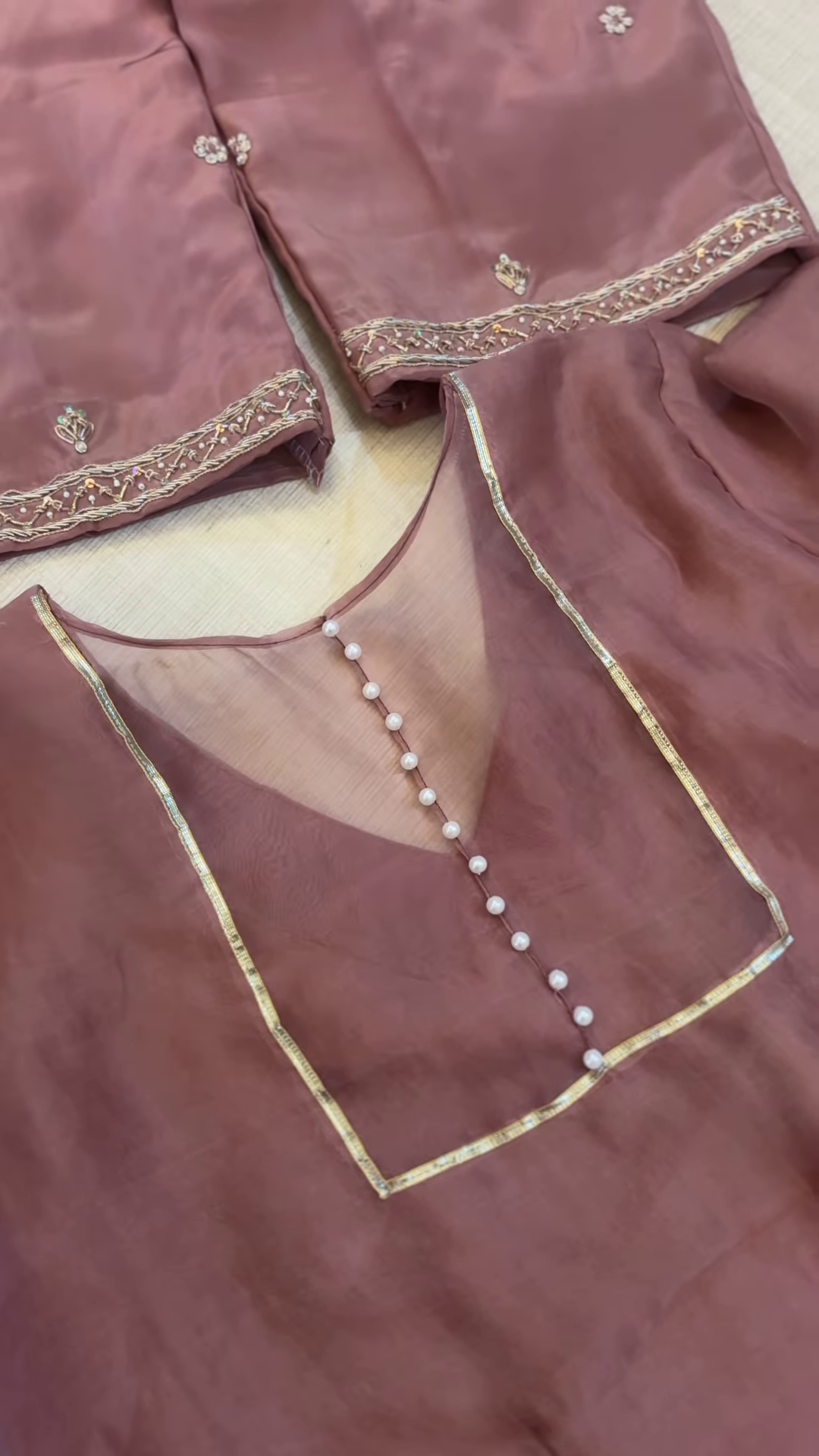 The kameez fabric, in a soft and dusky rose, showcases a distinctive V-neckline design. The neckline is accentuated by a border of тонкий metallic zari, likely in a gold or silver tone, which adds a touch of subtle shimmer and definition to the shape. Running vertically down the center of the neckline, from the apex of the V, is a row of small, lustrous faux pearls. These pearls add a touch of classic elegance and create a focal point on the upper bodice. The simplicity of the design, with the focus on the pearls and zari, lends a modern and minimalist aesthetic to the traditional silhouette. The tissue silk fabric of the kameez drapes beautifully, enhancing the overall sophisticated look.