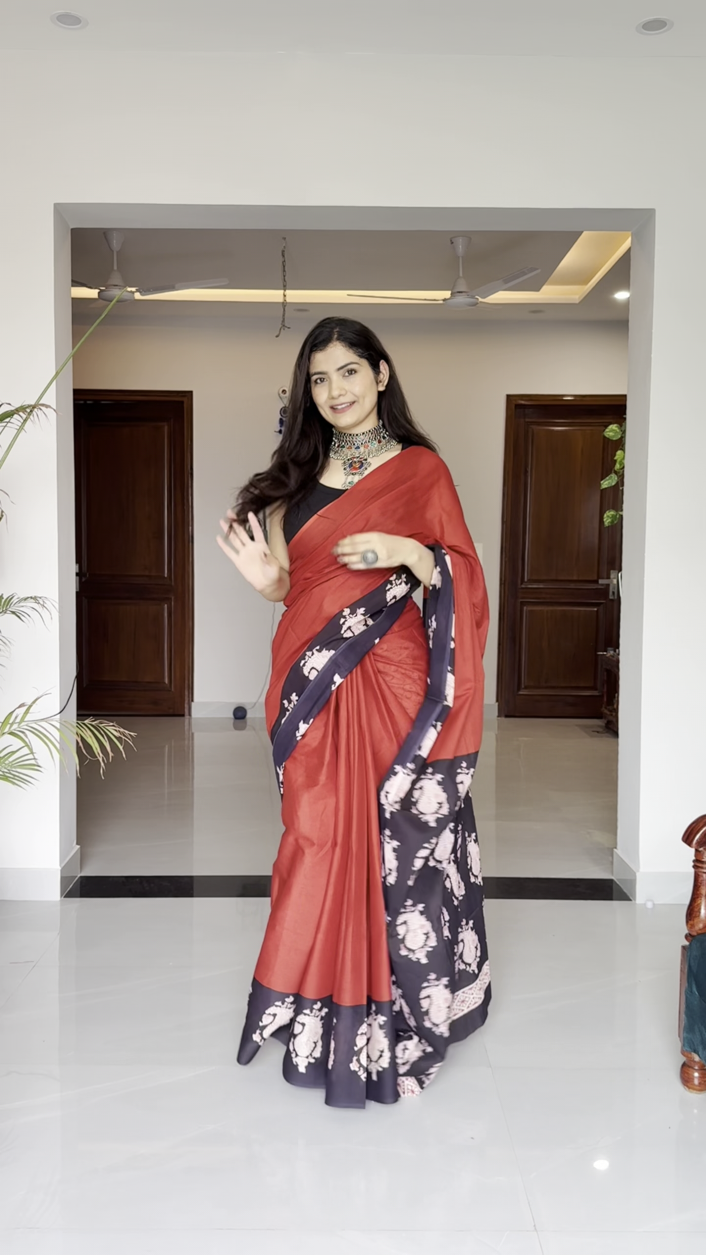 The back design depends on blouse preference—whether you opt for deep cuts, tie-backs, or traditional closures, the saree complements them effortlessly.