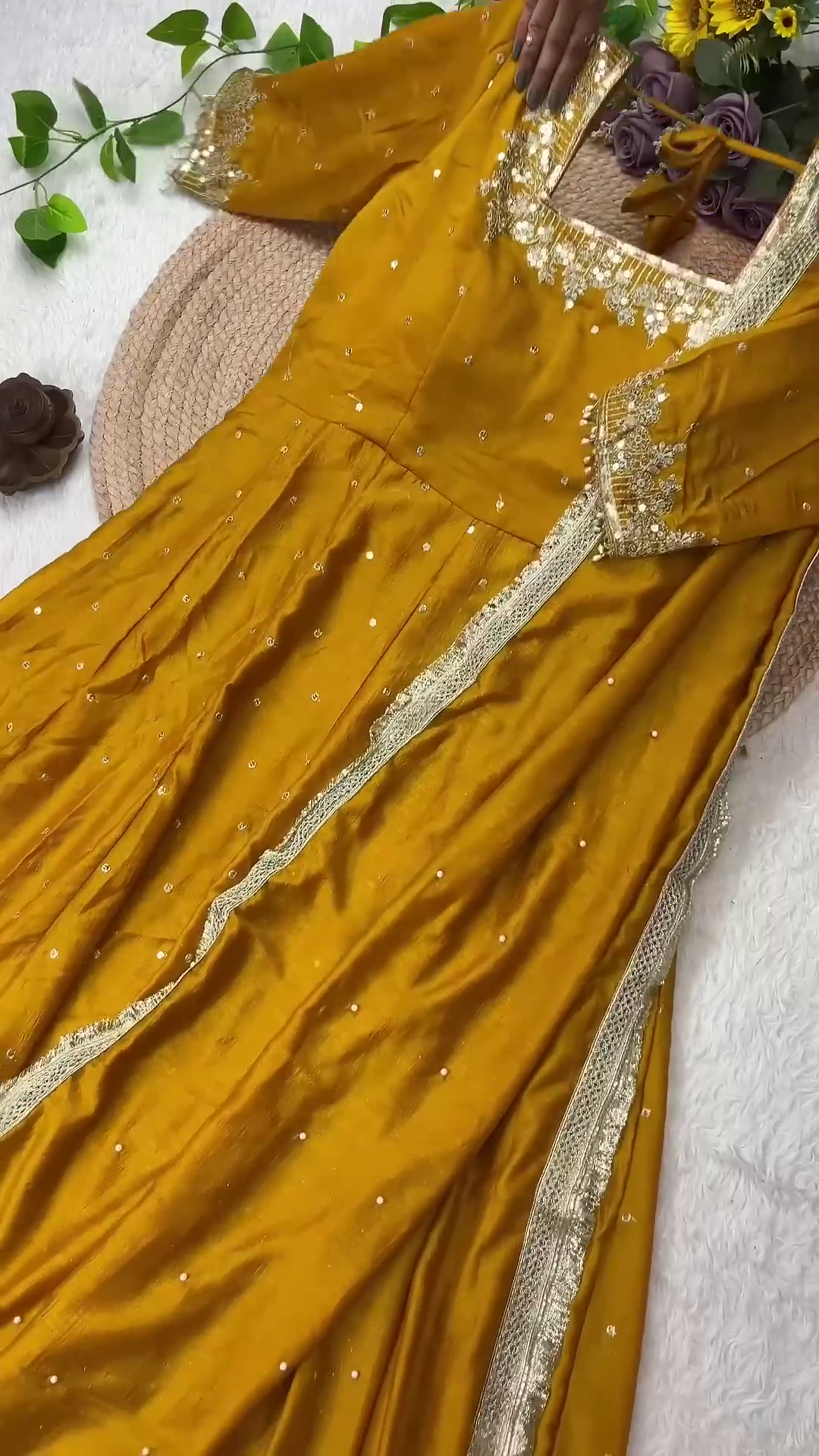 Embroidery Material: High-grade golden zari thread and shimmering metallic sequins.
