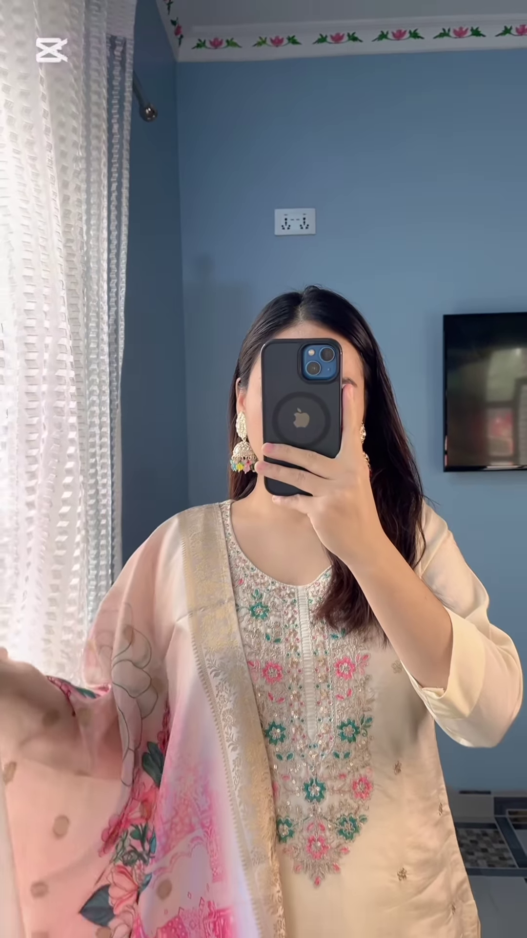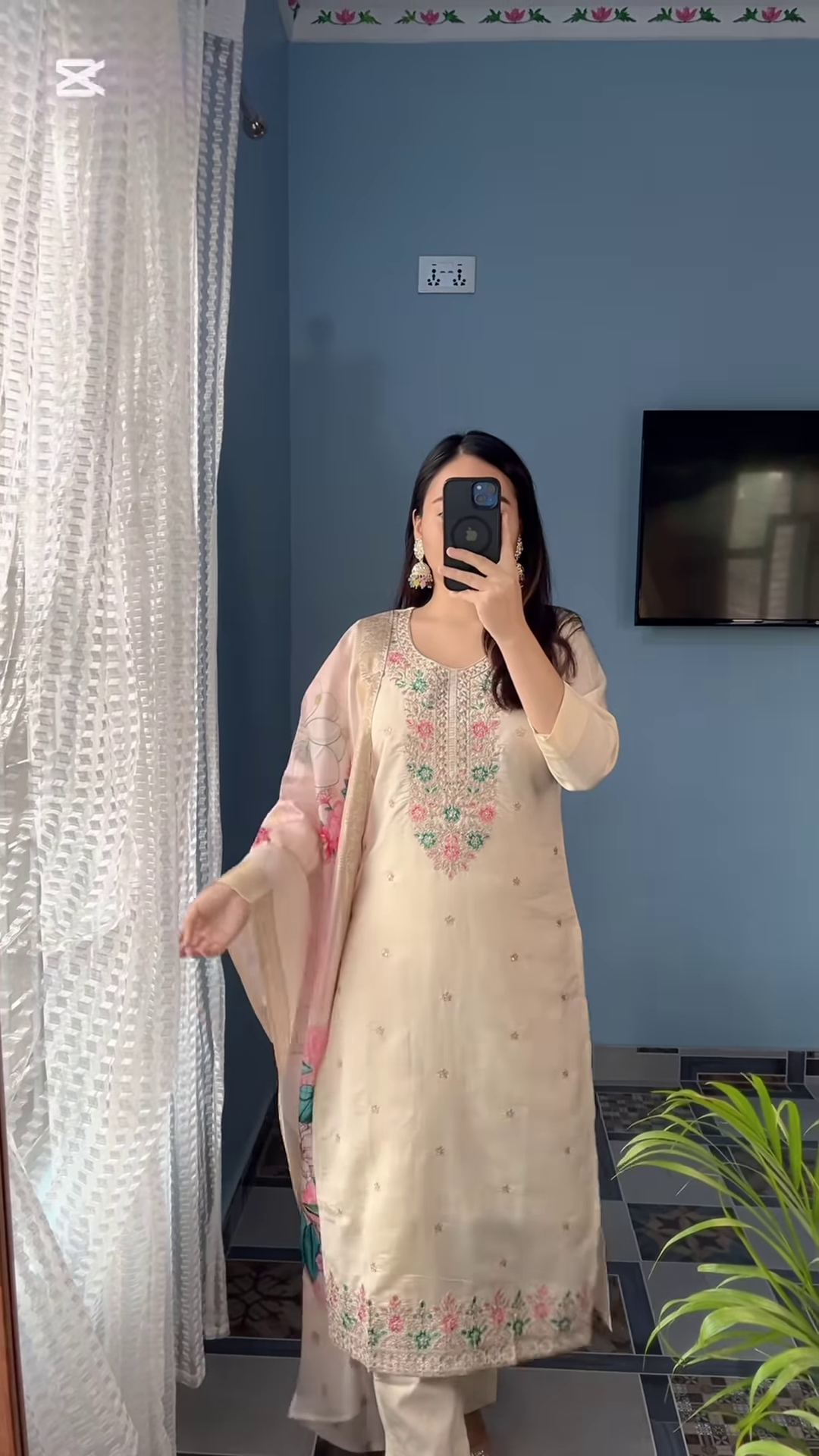 A timeless ivory base with pastel floral embroidery brings out a serene and graceful aesthetic. The straight-cut kurta with three-quarter sleeves offers a classic, flattering fit, while the organza dupatta with floral accents adds a dreamy, ethereal touch.