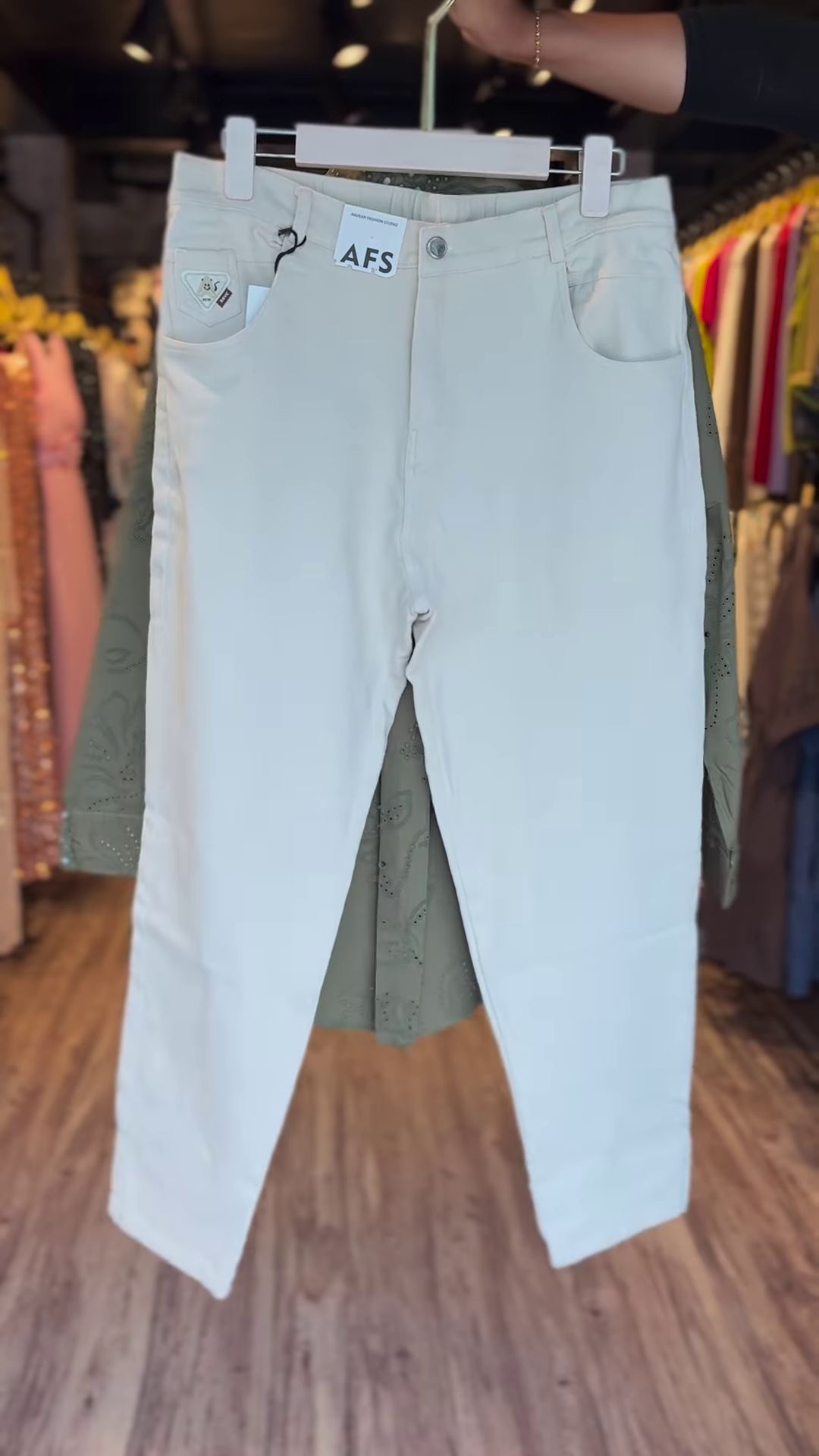 The outer shirt features all-over floral eyelet embroidery enhanced with tiny mirror accents that add subtle shimmer. The matching smocked crop top beneath creates a textural contrast while staying cohesive with the tone-on-tone palette. Paired with white straight-fit pants for a crisp, breezy balance.