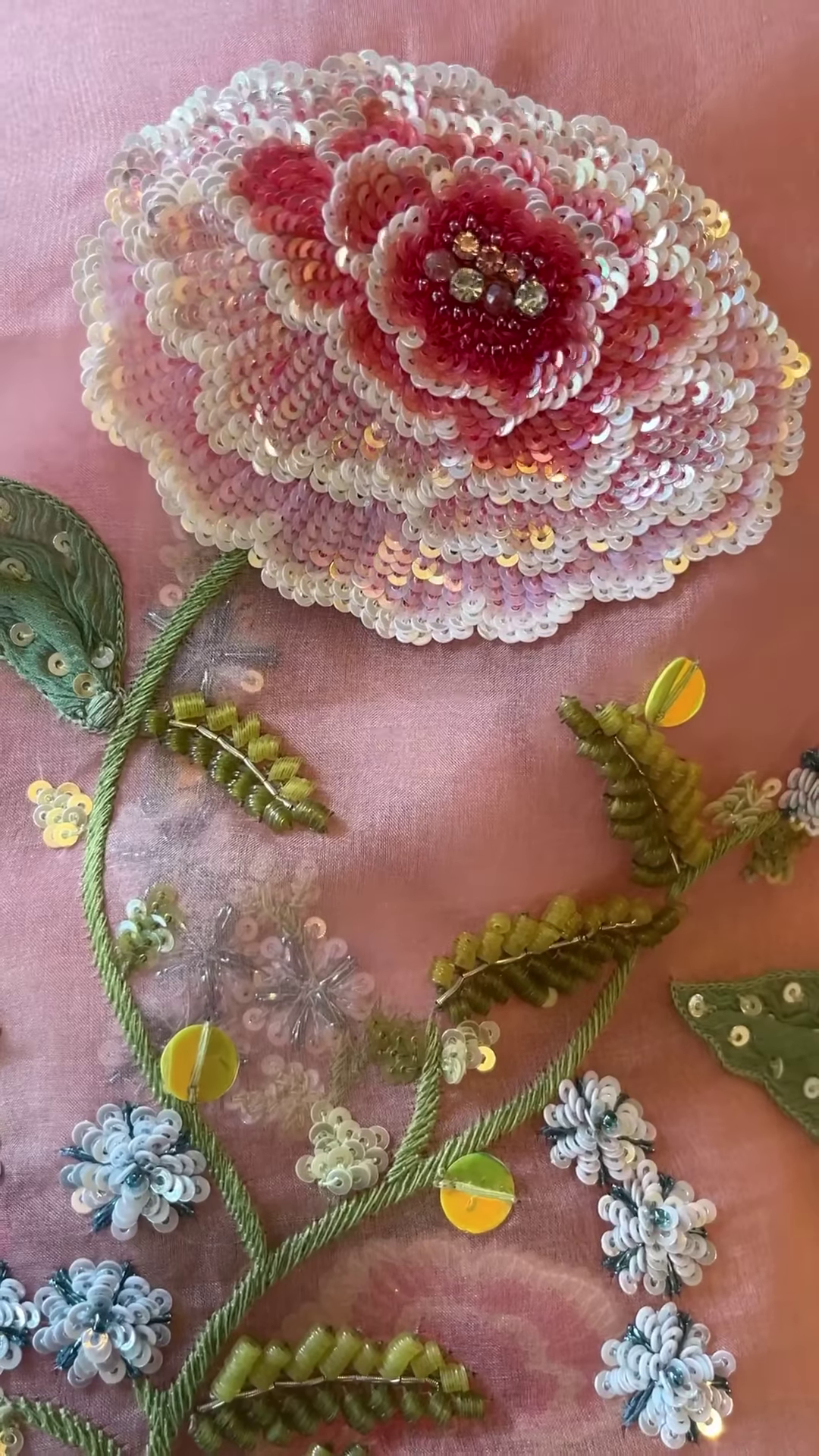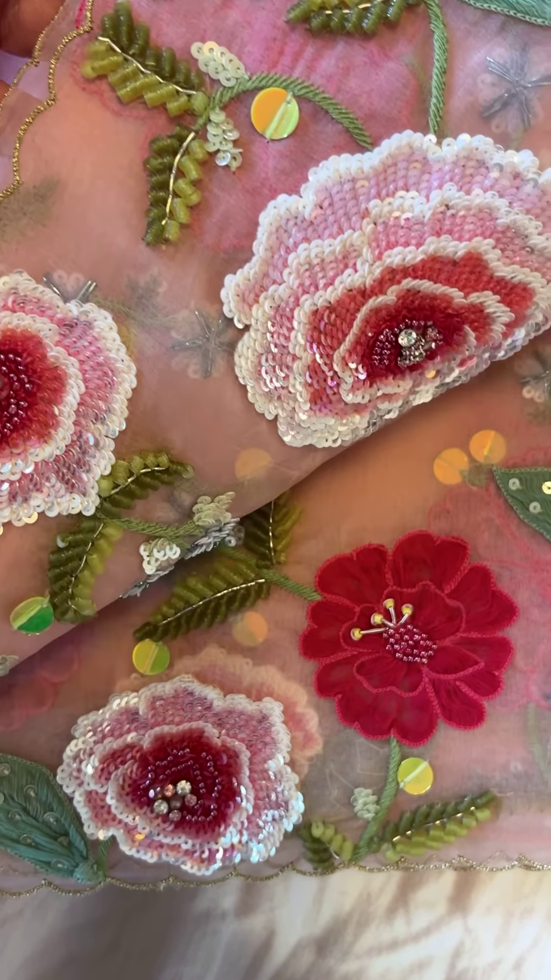 The pink dupatta, on the other hand, is a statement piece on its own. Bursting with vivid hot pink 3D floral appliqués, tiny green sequin leaves, and scalloped edges with zari embroidery – it adds a pop of color and turns the whole outfit into a showstopper.