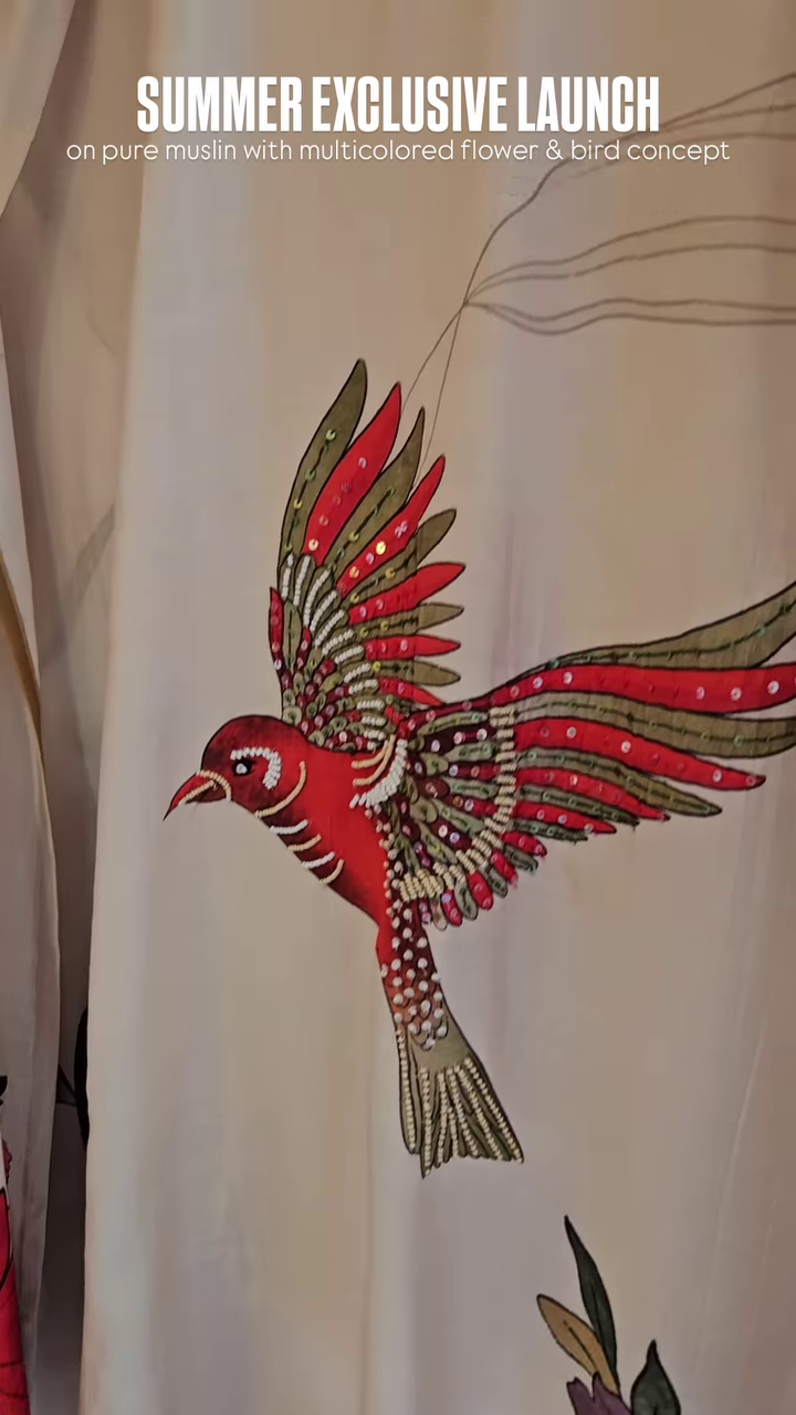 Pure Muslin Fabric with Multicolor Floral & Bird Print – “Summer Exclusive Launch” Textile Promotion