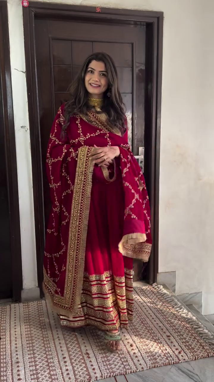 The Anarkali features exquisite golden thread embroidery along the borders, hemline, and dupatta, adding a rich festive appeal. The dupatta is beautifully detailed with floral embroidery and finished with a golden lace trim, elevating its elegance. The suit’s hemline is accentuated with broad striped golden embroidery, making it stand out with royal charm.