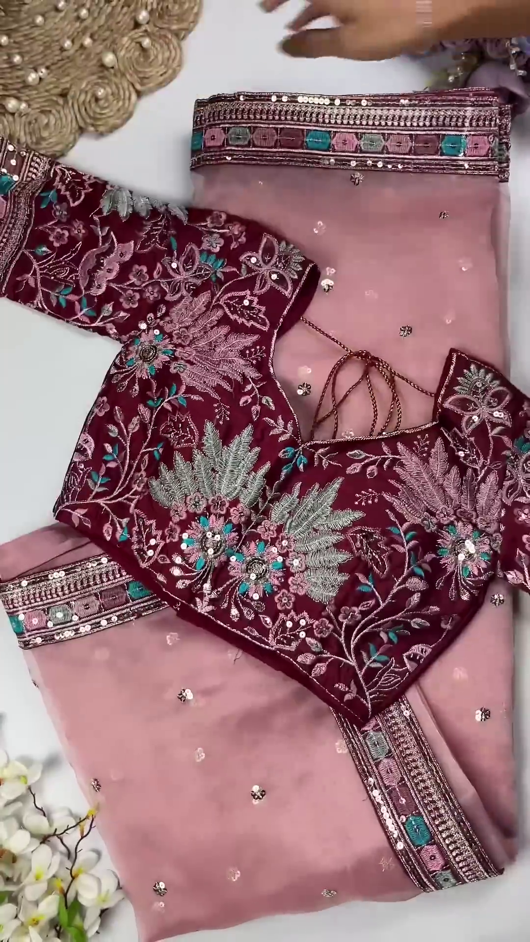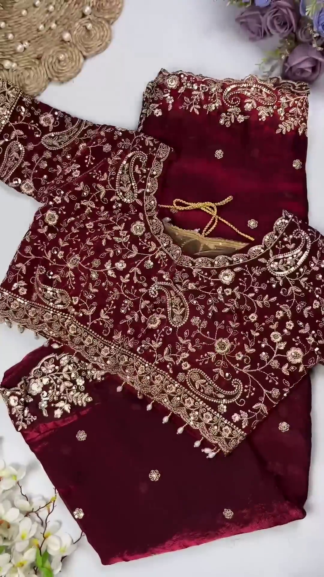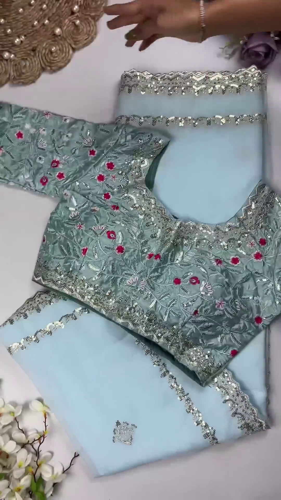 ✔️ Dense Floral Work: Close-ups showcase the rich, multi-layered thread and sequin embroidery covering the entire blouse.