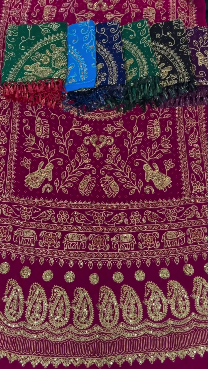 Step into regal elegance with this exquisite Rajasthani hand-embroidered suit set. Designed with intricate zari work and traditional motifs, this masterpiece reflects the rich heritage of Indian craftsmanship. Perfect for festive occasions, weddings, and cultural celebrations, this luxurious ensemble exudes grandeur and sophistication.