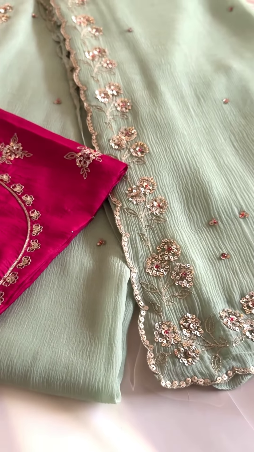 The pairing of the serene sea green saree with the bold fuchsia blouse creates a visually appealing and contemporary color combination. The subtle shimmer of the embellishments on the saree adds a touch of understated elegance, while the rich embroidery on the blouse provides a focal point of traditional artistry. This set is perfect for those who appreciate a blend of subtle sophistication and vibrant color. It would be an excellent choice for daytime events, evening gatherings, or festive celebrations where a touch of refined glamour is desired. The lightweight fabric of the saree ensures comfort, while the detailed embroidery on the blouse adds a touch of traditional richness.