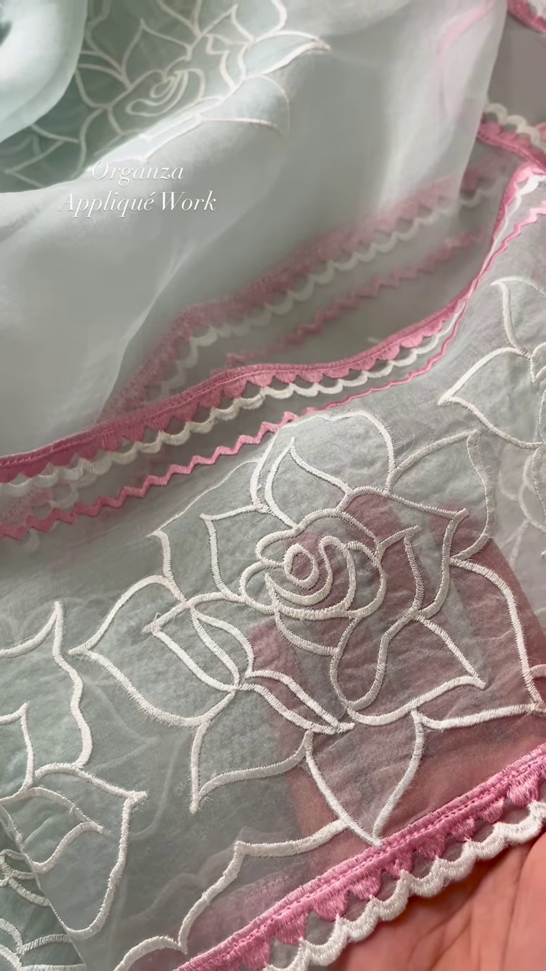 The dupatta (scarf) in this set appears to be made from a matching sky blue organza fabric and features coordinating white appliqué work along its borders. The design on the dupatta likely mirrors or complements the patterns on the kameez, creating a cohesive and well-designed ensemble. The тонкий pink border is also likely present on the dupatta, framing the appliqué work and tying the entire set together with a sense of refined elegance. The lightweight and sheer nature of the organza allows the appliqué work to be beautifully showcased, creating a visually appealing and textured effect.