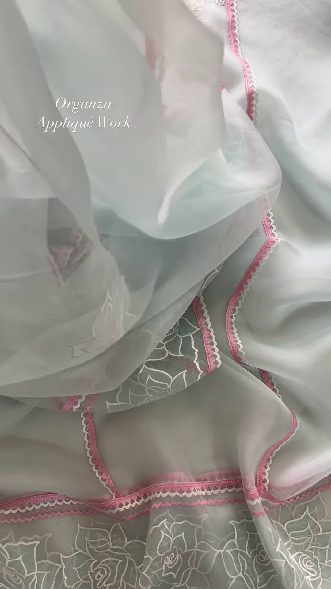 Adding a delicate touch of color and definition is a тонкий pink border that outlines the neckline, the edges of the front placket, and potentially the hemline and sleeve edges. This тонкий pink piping or trim adds a subtle pop of color and frames the white appliqué work beautifully, enhancing the overall design. The combination of the soft blue organza, the crisp white appliqués, and the delicate pink accents creates a fresh and contemporary aesthetic.