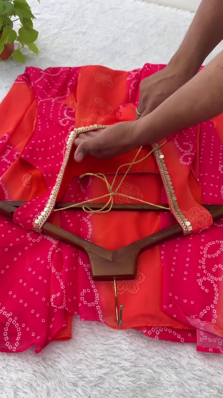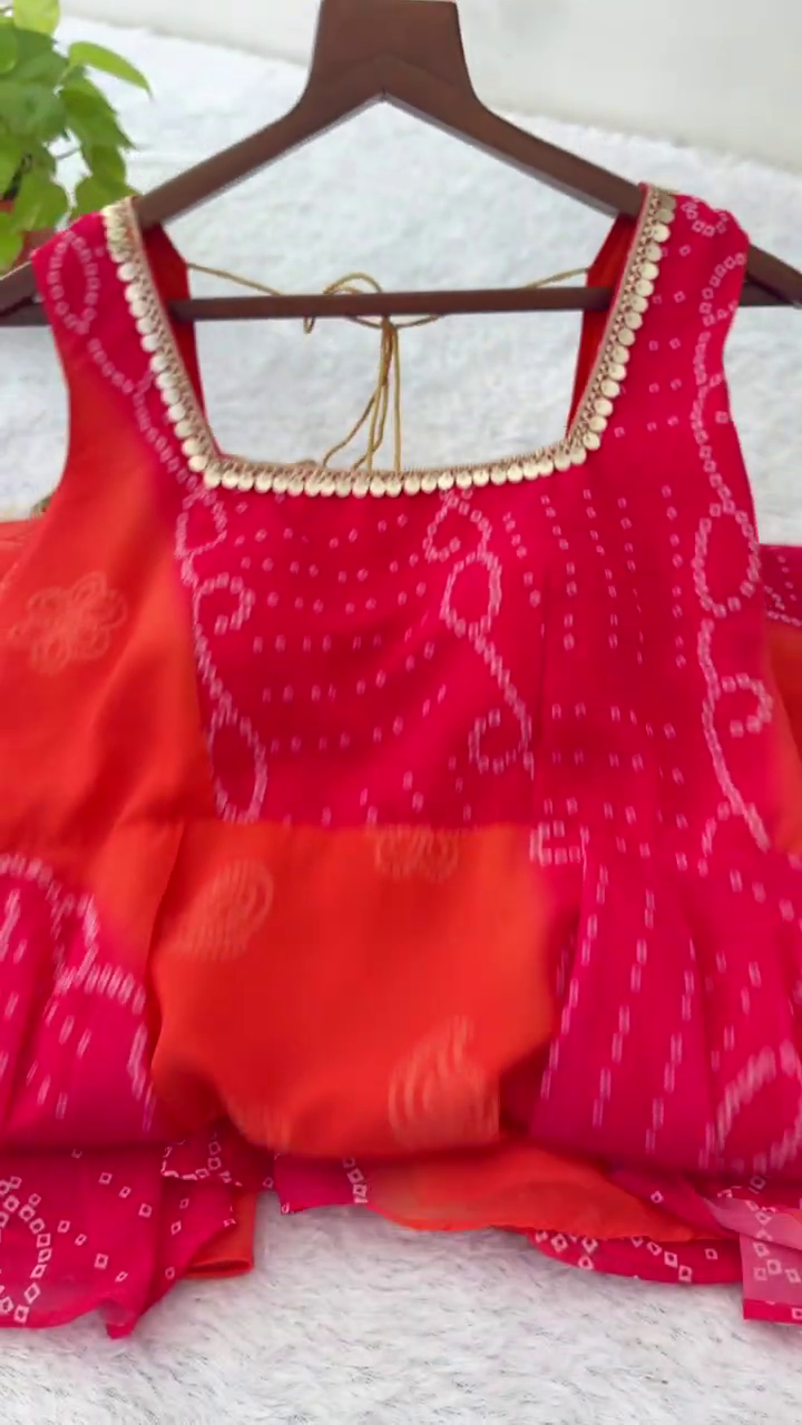 Radiate vibrant festive energy with this striking pink and orange designer Anarkali. Combining traditional tie-dye artistry with contemporary boutique finishes, this ensemble features a multi-tonal palette that captures the essence of a traditional “Bandhani” aesthetic, making it an ideal choice for Mehendi ceremonies, Haldi rituals, and daytime festive celebrations.