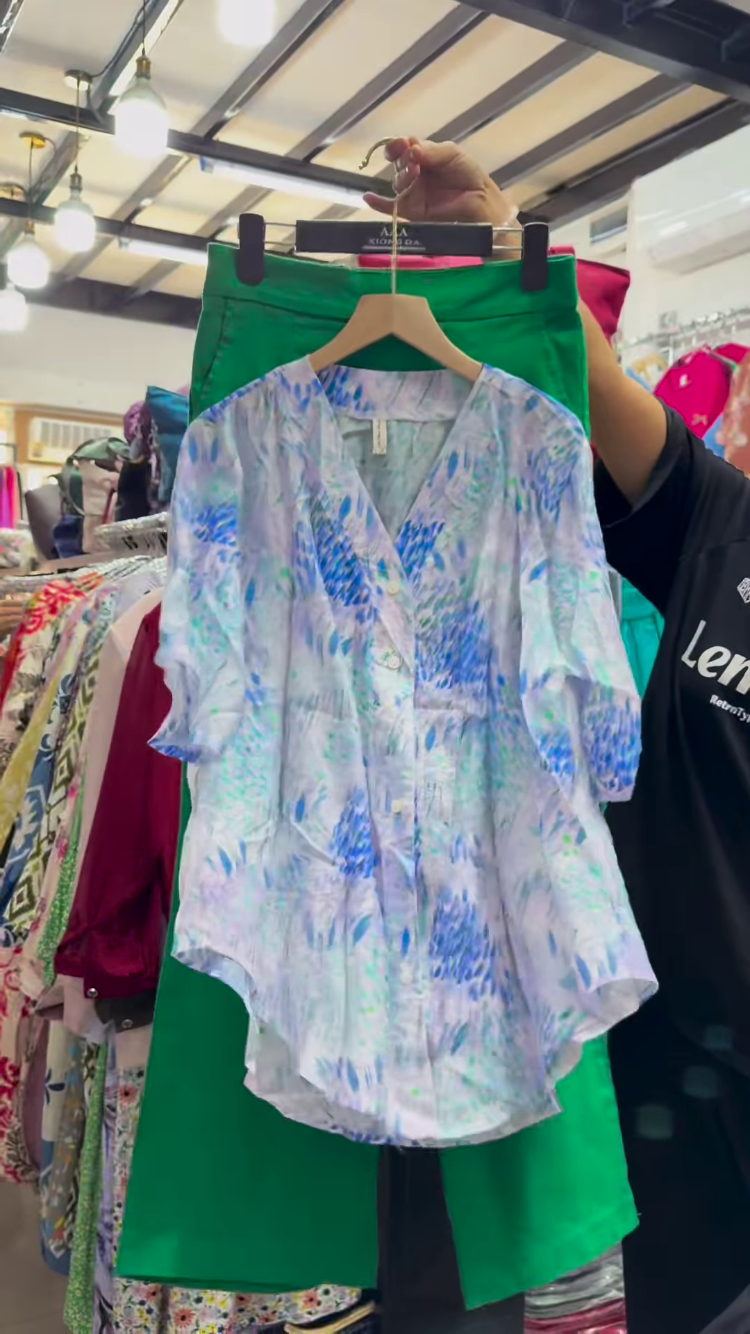 Make a bold impression with this standout unisex outfit featuring a striking geometric print button-up shirt paired with a classic green skirt—blending street-smart edge with everyday wearability. Whether curated for retail displays, fashion shoots, or casual wear collections, this ensemble offers a modern twist on color-blocking and print-play.