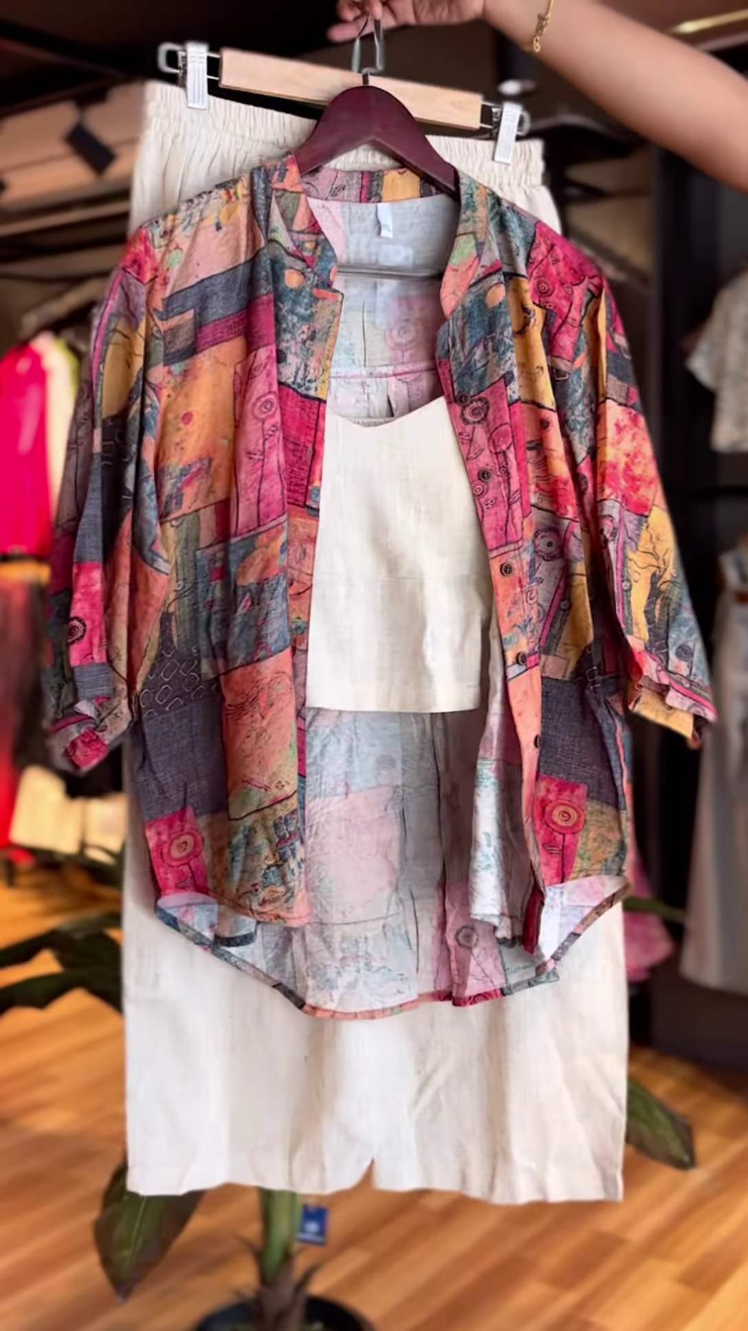 The inner layer features a sleeveless ivory-white cropped top and relaxed-fit bottoms in matching off-white. These serve as the perfect base for the lightweight, oversized shrug that drapes elegantly over the silhouette. With its shirt-style cut, front buttons, and asymmetrical hemline, the shrug balances structure with flow, giving you a bohemian edge that’s effortlessly stylish.