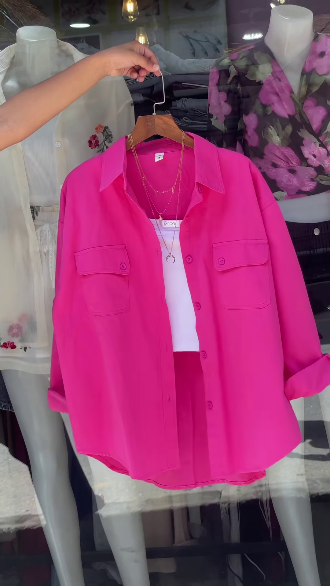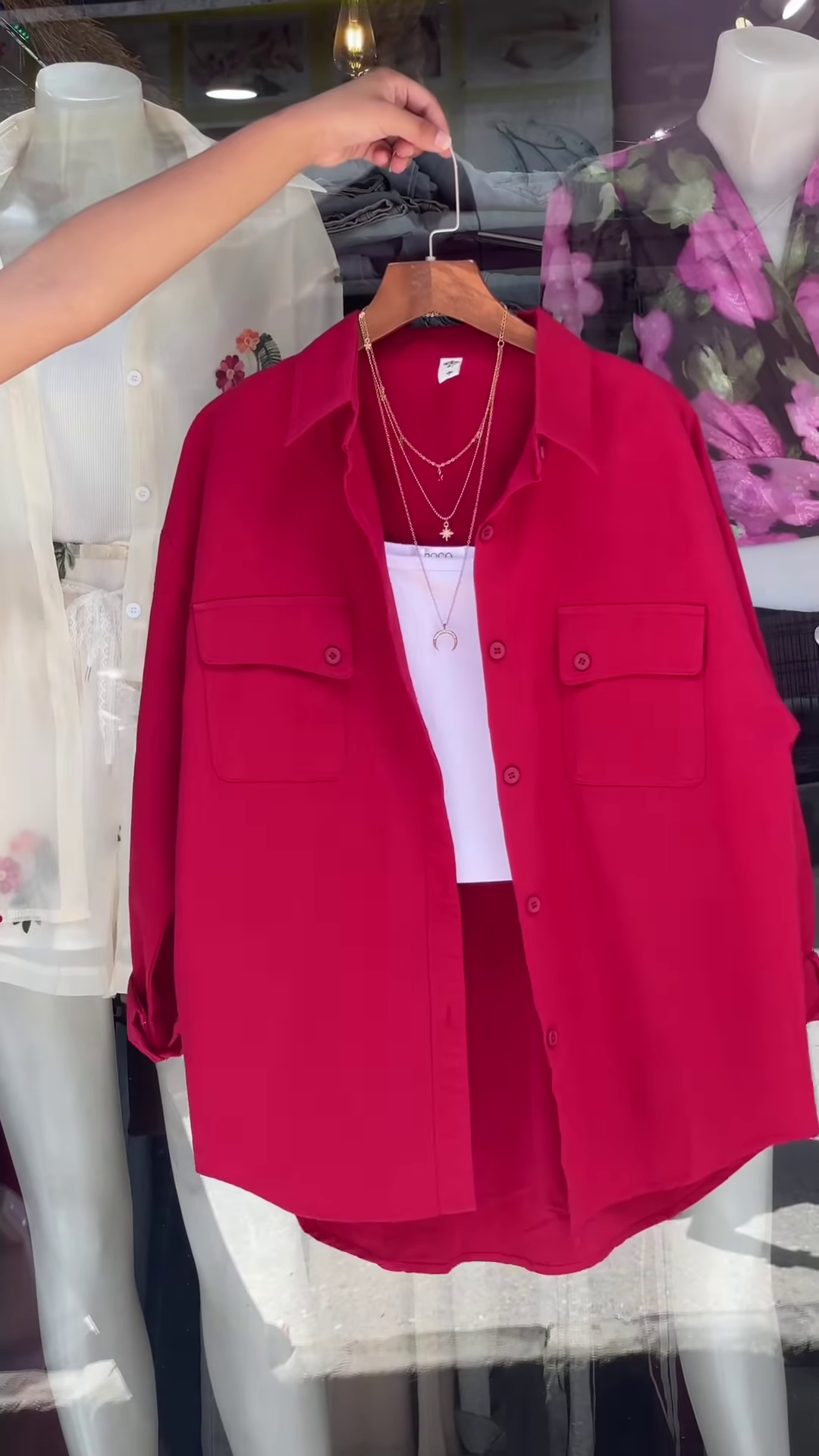 This vibrant green oversized button-down shirt is incredibly versatile. Pair it with your favorite denim jeans or shorts for a classic, relaxed look. For a contemporary, monochromatic ensemble, combine it with trousers or skirts in a similar green tone. To create a striking contrast, wear it with crisp white or black bottoms. Accessorize with minimalistic layered necklaces, as suggested in the image, to add a touch of personal flair without detracting from the shirt’s bold color. Its adaptability makes it suitable for casual outings, weekend adventures, creative work environments, or even as a stylish cover-up over swimwear.