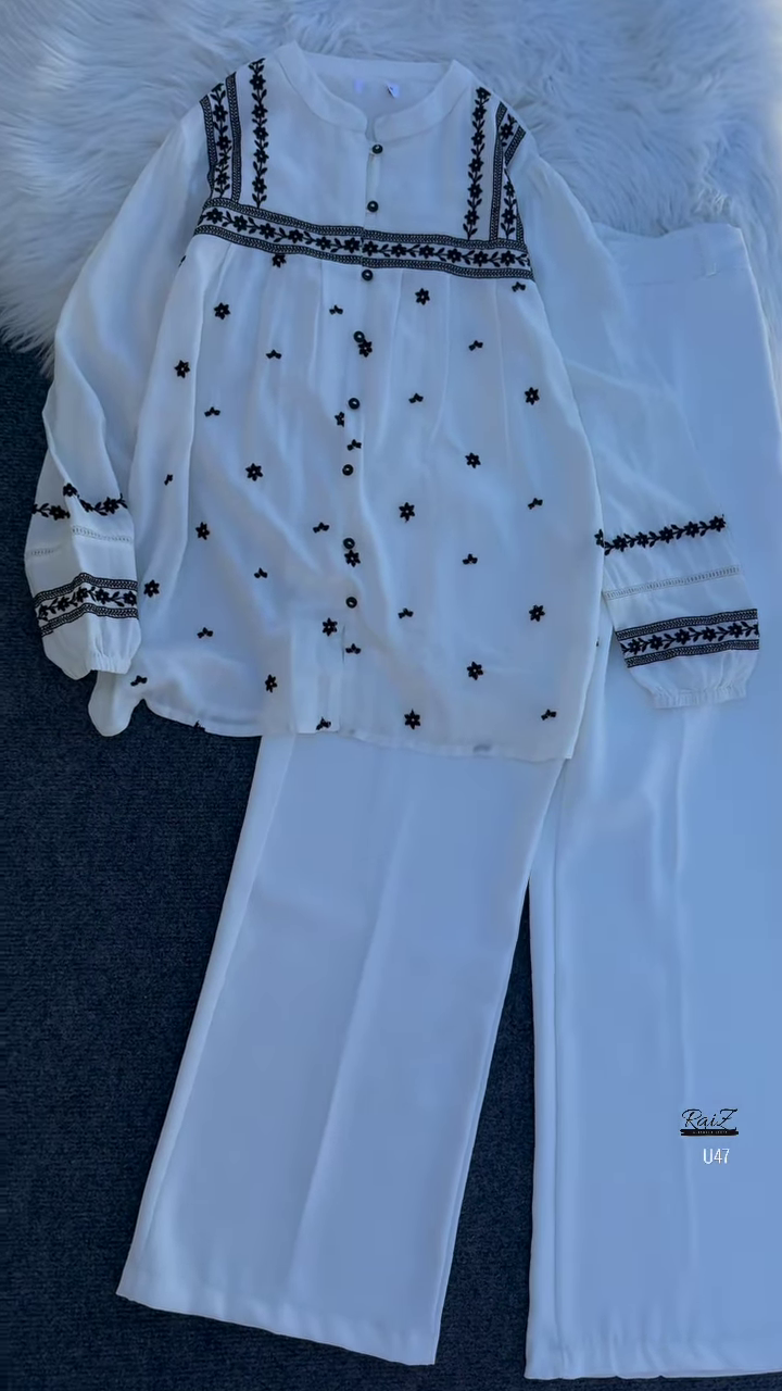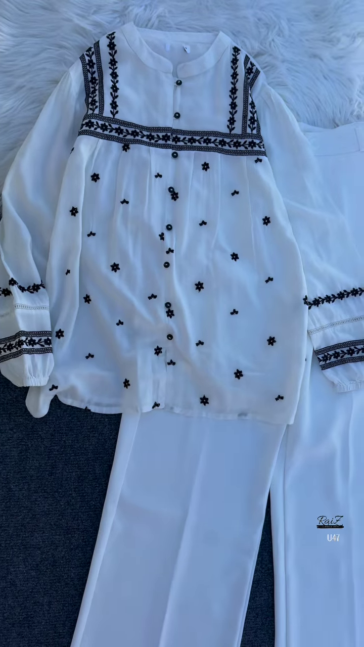 White Floral Embroidered Kurta Set with Wide-Leg Trousers – Elegant Indo-Western Fusion for Everyday Grace