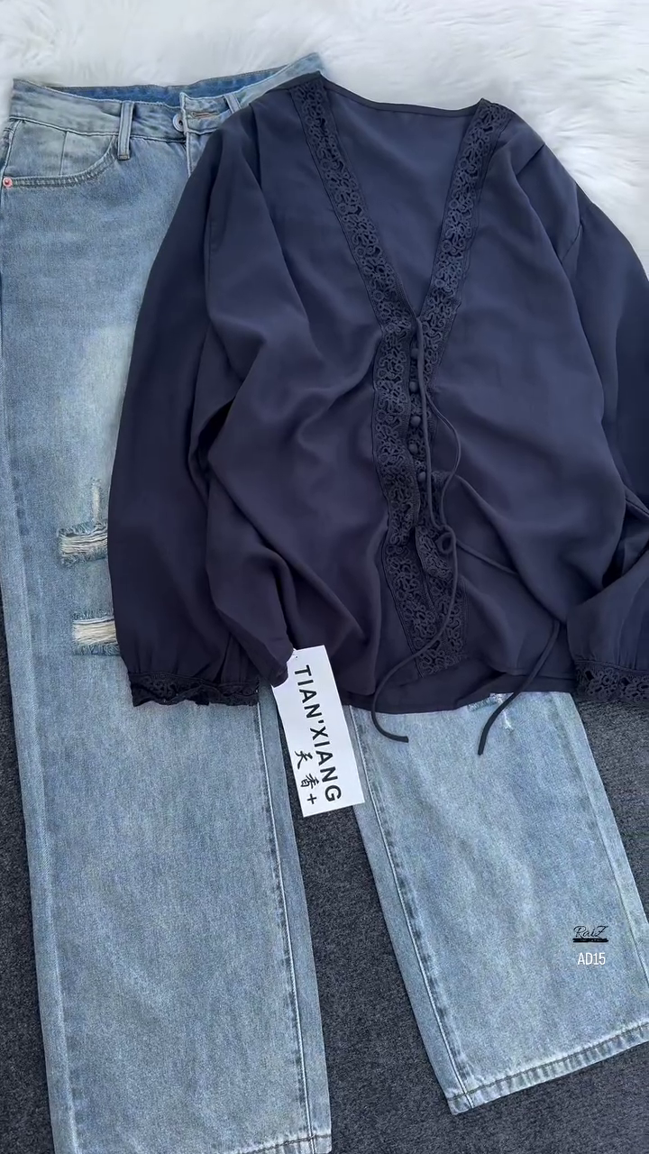 Balancing the delicacy of the blouse, the set includes light-wash distressed jeans for a modern, casual vibe. With soft fading and subtle ripped details, these jeans create a laid-back yet stylish contrast against the refined top. The high-waisted cut elongates the figure, while the straight-leg design offers comfort and versatility for all-day wear. The denim’s light tone complements the blouse’s dark elegance, making the pairing effortlessly eye-catching.