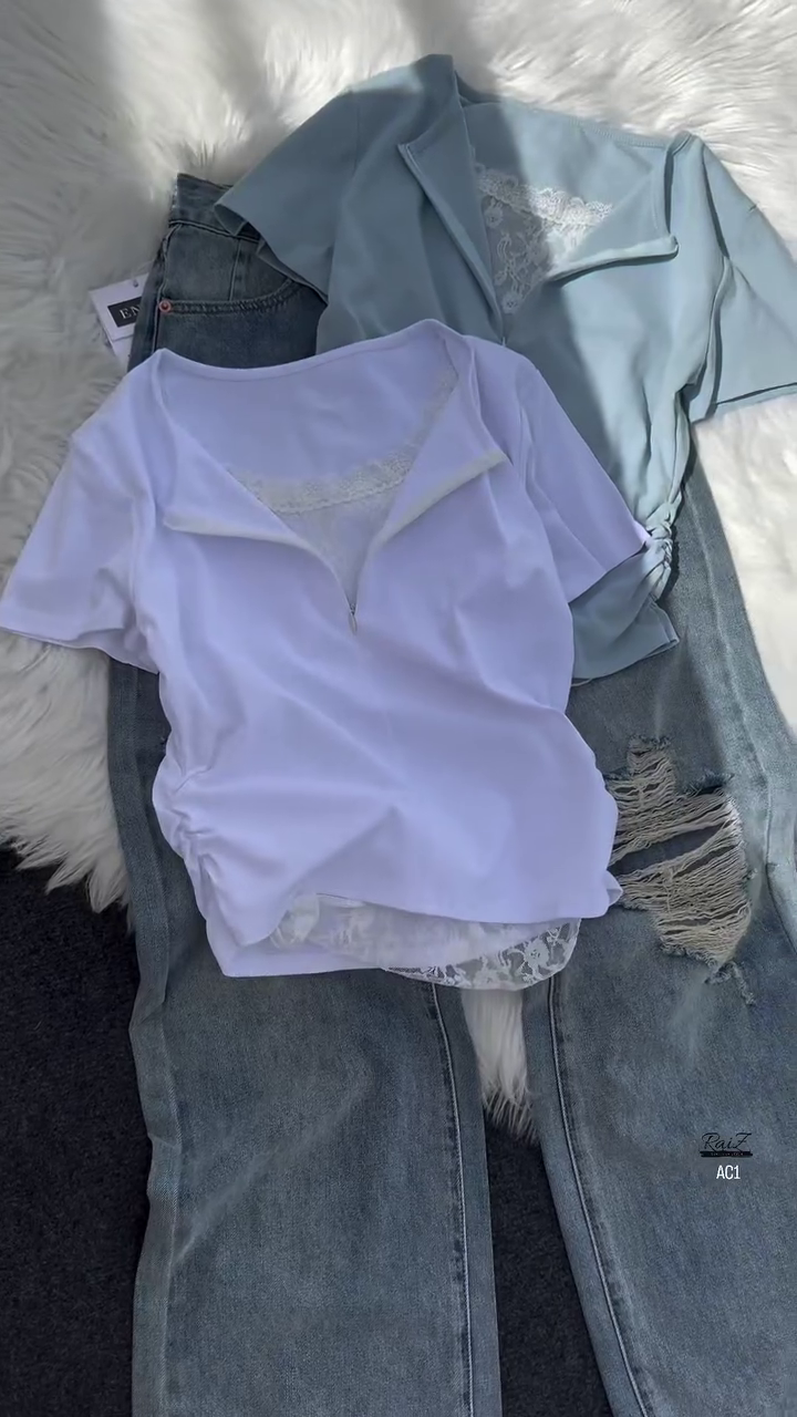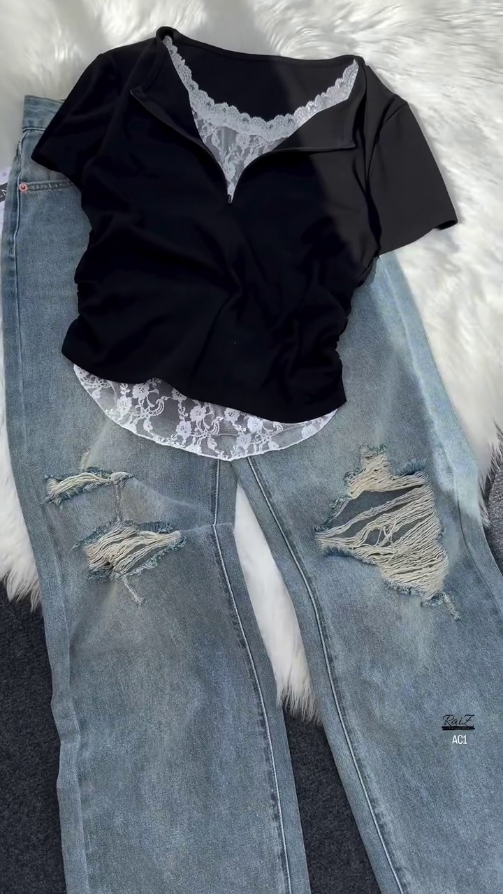 Crafted from lightweight, breathable fabric, the top ensures maximum comfort throughout the day. Its short sleeves and relaxed fit provide ease of movement, while the lace peeking through the neckline and hemline offers a refined finish. Whether worn as a statement piece on its own or layered under a jacket or cardigan, this top adapts seamlessly to your style needs.