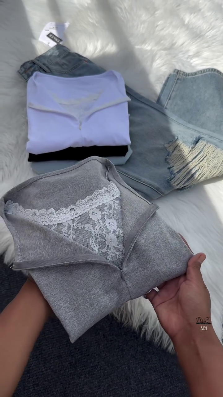 The highlight of this top lies in its stylish V-neckline, subtly layered with intricate white lace detail. The lace insert adds a romantic touch, creating a graceful contrast against the plain grey fabric. This delicate element not only enhances the top’s overall design but also gives it a unique edge, making it suitable for both casual outings and slightly dressier occasions.