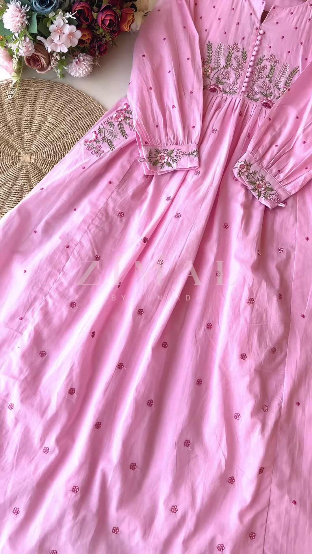 Presented on a hanger held in-hand by someone wearing a beaded bracelet, the image adds realism and boutique depth. The woven mat and bouquet of multicolored flowers in the background provide campaign harmony, ideal for WhatsApp storytelling or catalog thumbnail consistency. These elements suggest warmth, handcrafted appeal, and styling inspiration that can translate into carousel captions or influencer posts.