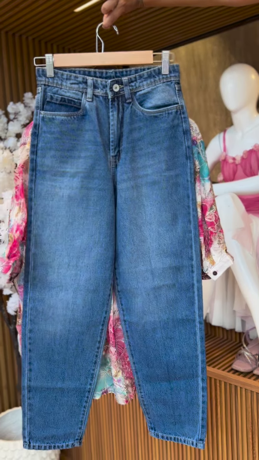 The backdrop featuring mannequins and greenery subtly enhances the retail relevance, suggesting boutique positioning and lifestyle integration. Whether styled for real-world casual wear or fashion-forward online listings, the mix of floral pattern, denim structure, and white basics makes this outfit a winning choice for laid-back sophistication.