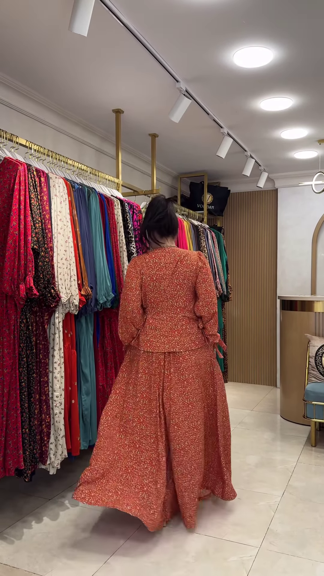 The backdrop of the store setting—gold shelving, ambient lighting, and colorful garment racks—suggests boutique relevance, positioning the outfit perfectly for display and storytelling. Pair the ensemble with oxidized jewelry, a structured tote, or open-toe flats to personalize the look. Add a soft scarf or minimal makeup for a daytime event or swap in metallic bangles and bold earrings for evening elegance.