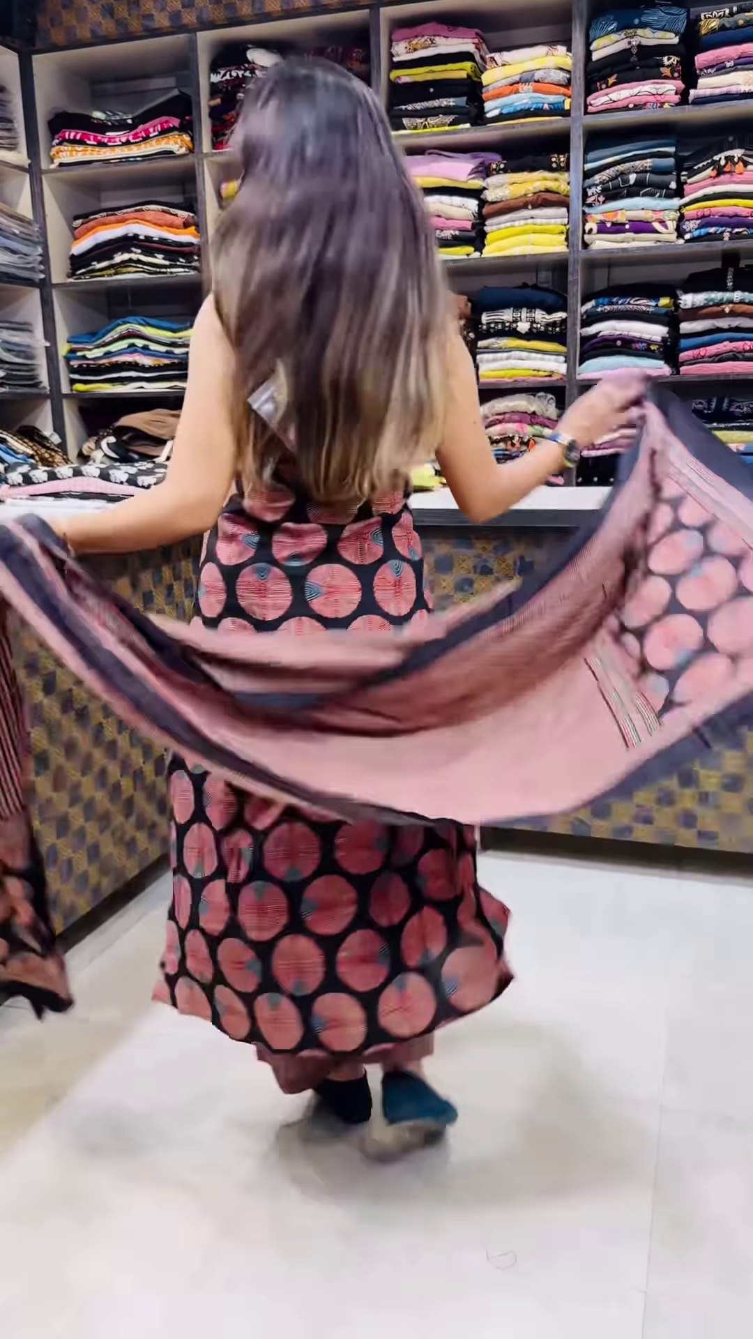 Set in a retail environment with shelves filled with folded garments in various colors and patterns, the image adds merchandising realism and campaign depth. The checkered counter design and ambient lighting reinforce the boutique setting, making the portrait ideal for WhatsApp status updates, ethnicwear carousel drops, or COD campaign storytelling.