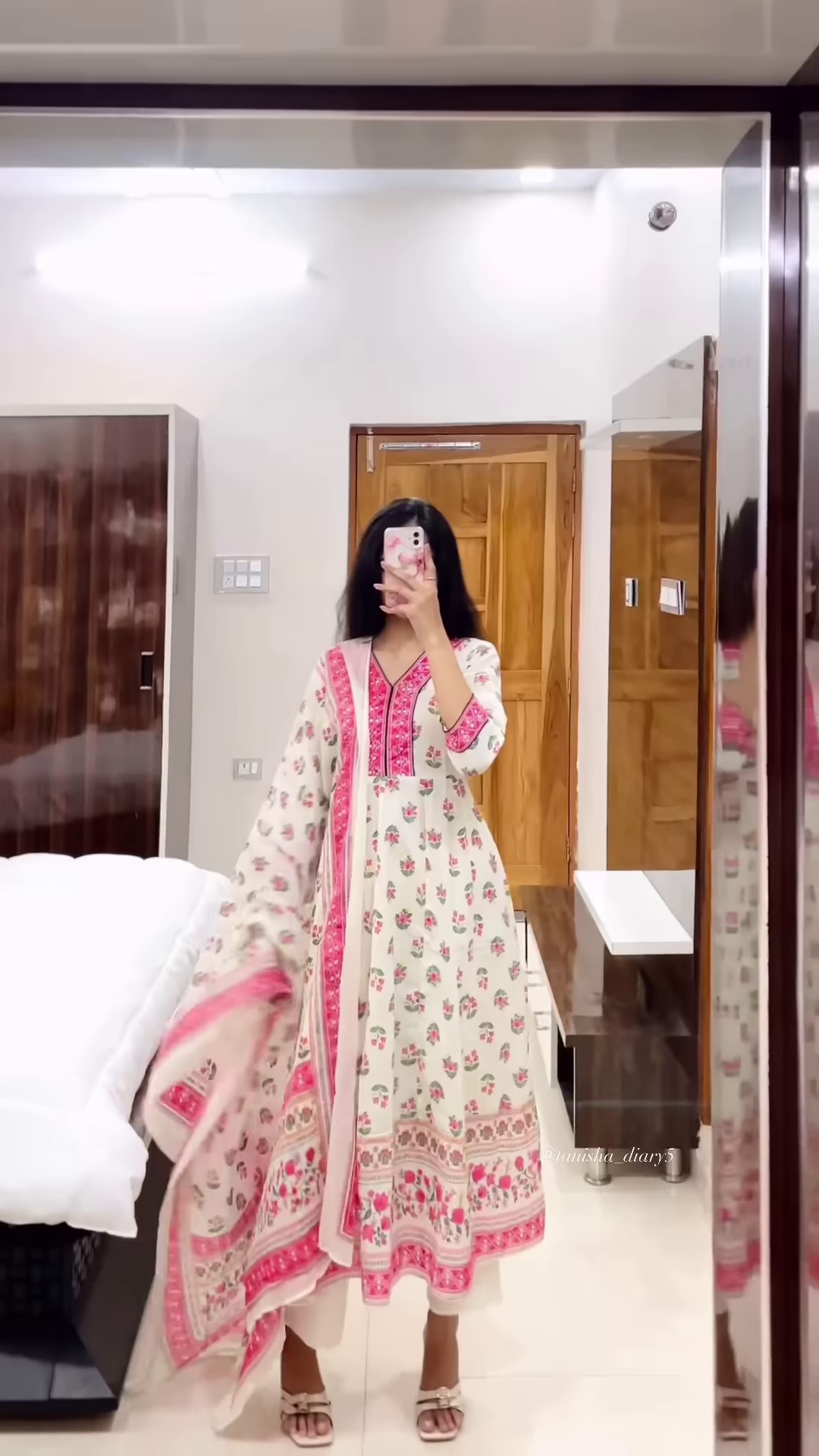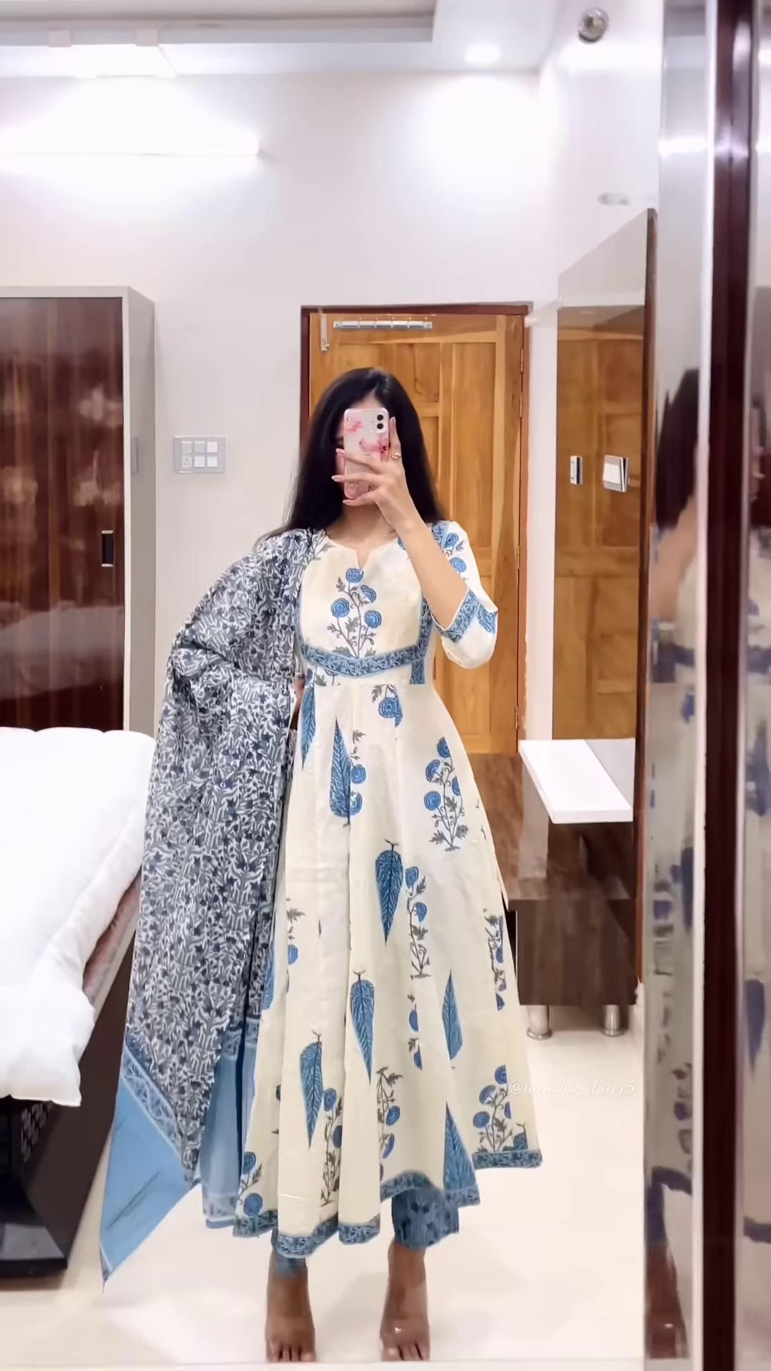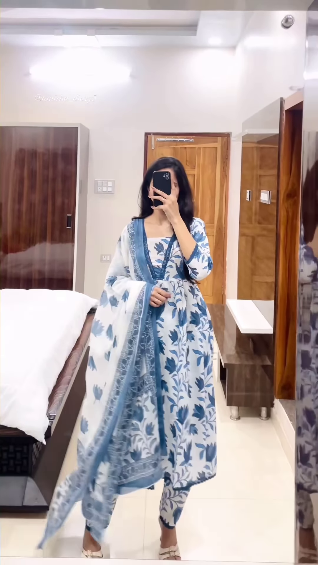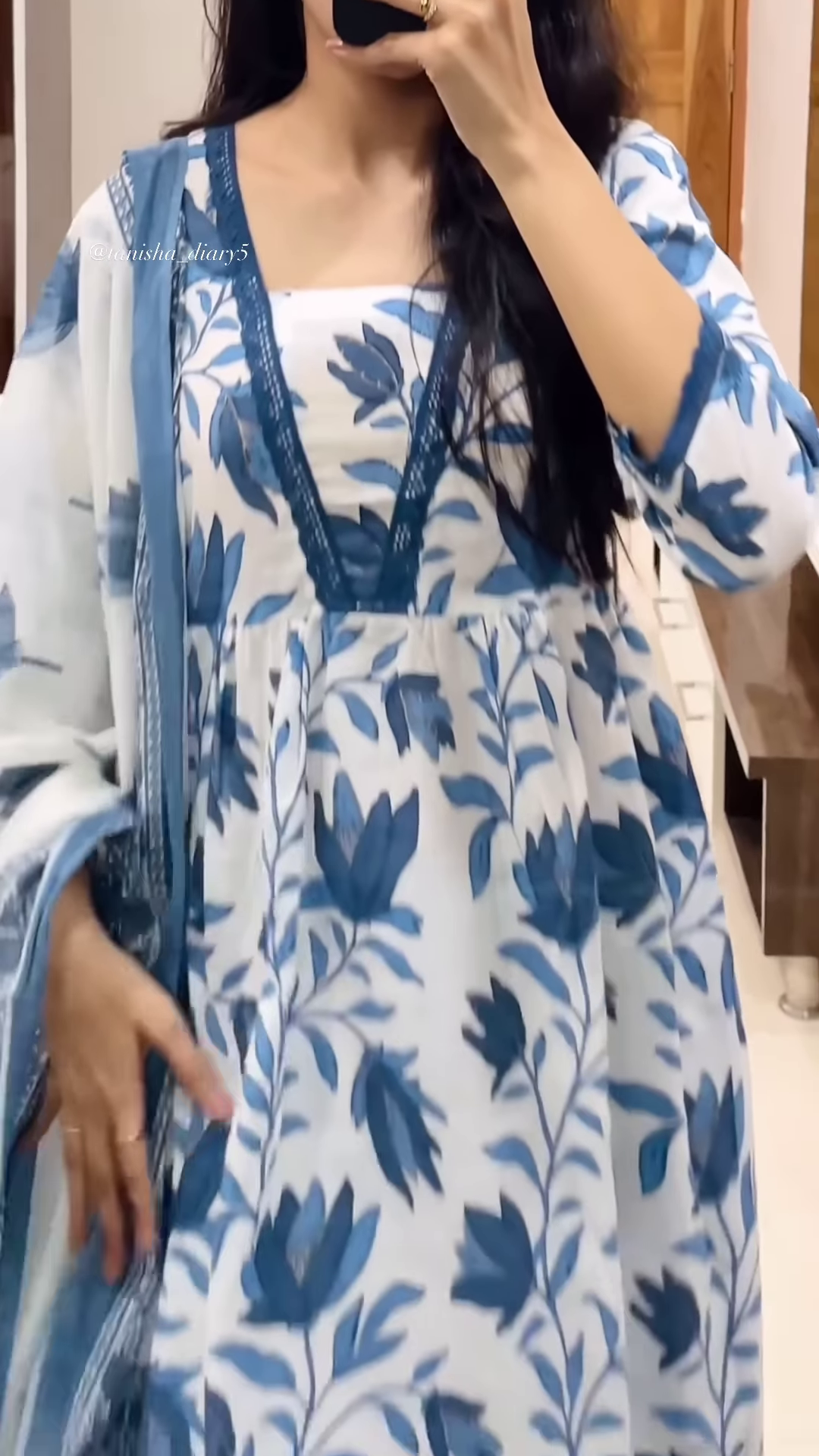 Captured in a mirror selfie for authenticity and relatability, the image provides realistic fit references for catalog thumbnails, haul reels, or online listings. The handheld phone and indoor backdrop contribute to lifestyle-driven presentation, making it ideal for WhatsApp carousel series or influencer-curated edits.
